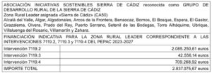 Por Resolución de 13 de febrero de 2025, de la Dirección General de Industrias, Innovación y Cadena Agroalimentaria, la Asociación Iniciativas Sostenibles Sierra de Cádiz fue reconocida como Grupo de desarrollo Rural de la Sierra de Cádiz, Zona Rural Leader asignada «Sierra  de Cádiz» (CA50) para las siguientes intervenciones y financiación: